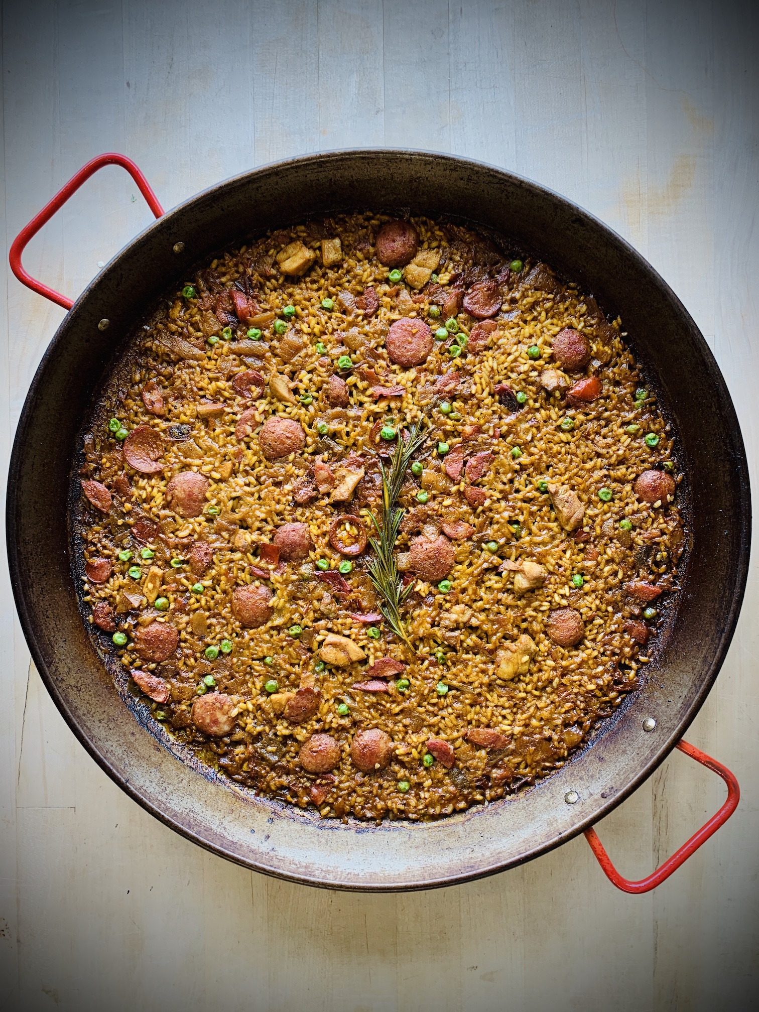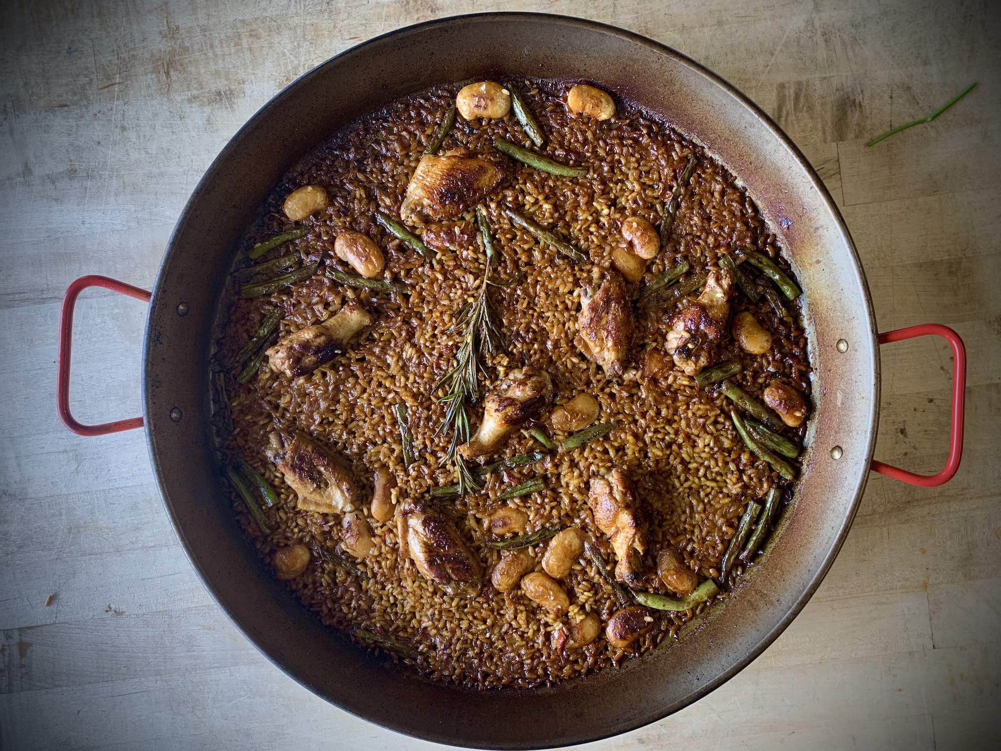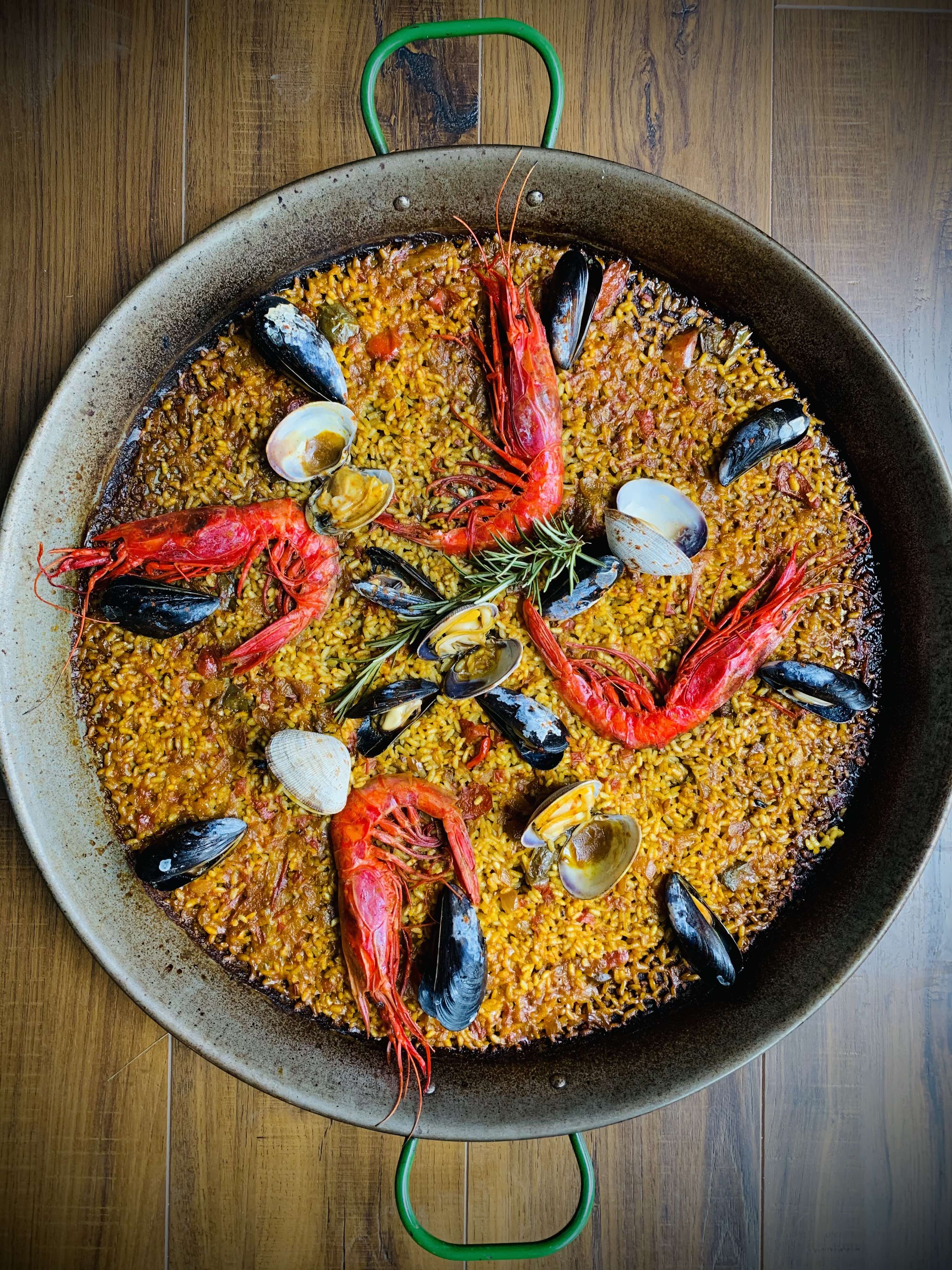 Grown in large rice fields, bomba rice is the most commonly used kind when making paella. This extraordinary dish expanded throughout the entire Spanish territory, bringing many different kinds of recipes. Traditionally, paella was cooked over pine or orange-tree firewood. The large pan was shared as a common center plate for everyone to eat from while using wooden spoons.